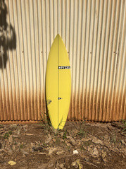 The thickness flow (foil) from nose to tail is balanced and clean, with the front of the board just barely thinner than the back half. The deck is flat-ish, keeping more foam (volume) out towards the rails. The actual rails are full just in from the outline (under the ball of your hand if you are holding the board under your arm), but are tapered to keep sensitivity and bite.