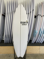 Introducing the Tiger Twin (2+1), the newest addition to the Pyzel Tiger Series. Originally designed for easy speed in weaker waves, the Tiger Twin is a special blend of two of our most loved smaller wave designs, the Happy Twin and the White Tiger. Both of these models have been favorites of our customers and team for years.The Tiger Twin is fast, responsive and user friendly, but also easy to paddle and good in weaker surf. It features a lower rocker, a wider beak nose and a single wing swallow tail.As with many of our best performing designs it has double concave through the majority of the bottom, running into a flat panel Vee off the tail which gives it the ability to roll over from rail to rail very easily despite its width. The rails are full but forgiving and the overall rocker allows for easy paddling and acceleration in smaller, weaker waves.Like the White Tiger it will give you a good reason to get out in the water on those marginal days of surf, but still being able handle a variety of waves on their better days. Designed as a twin + trailer, the Tiger Twin will suit those not quite yet ready to commit to a full-on twin, but excited to feel that speed and looseness.The Tiger Twin is something that everyone has been loving. Quick to accelerate, smooth riding, speedy down the line yet, still agile in the pocket.